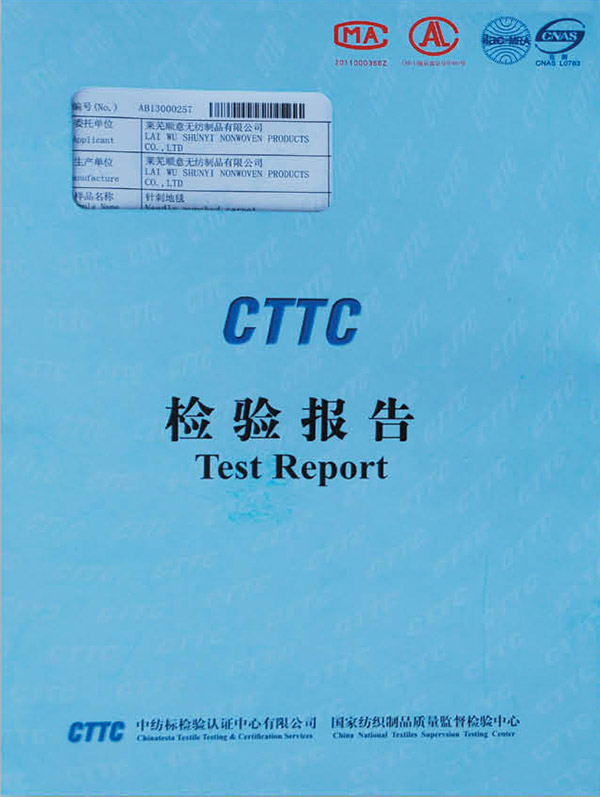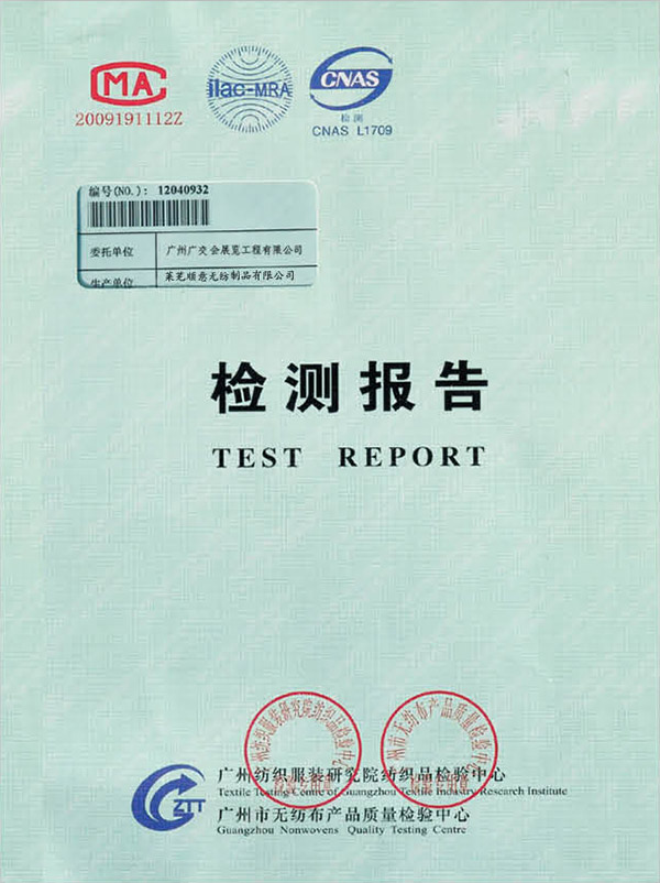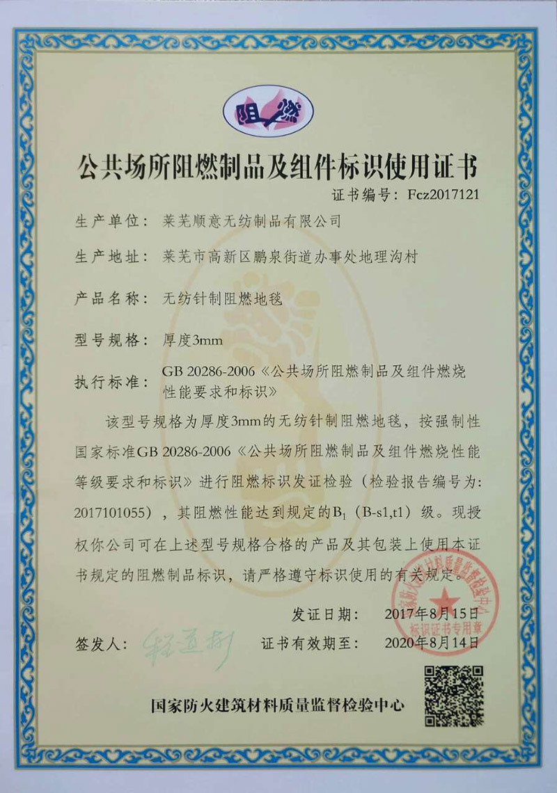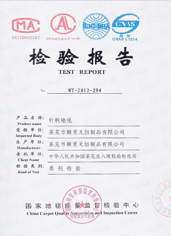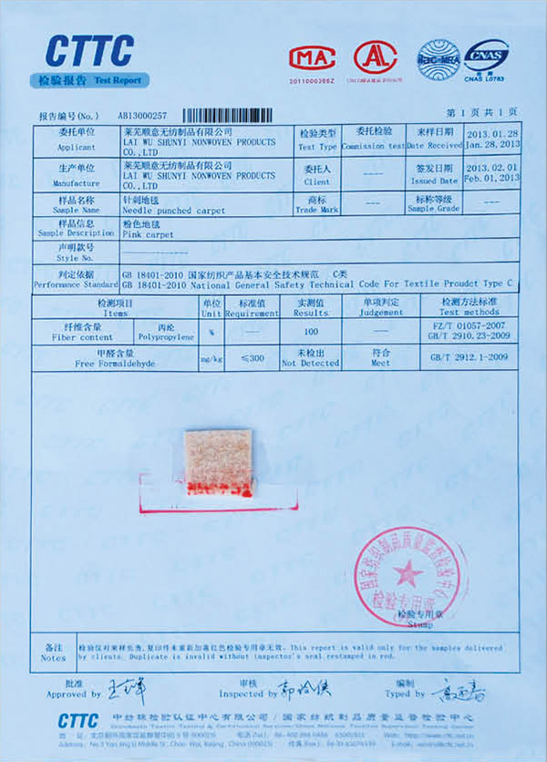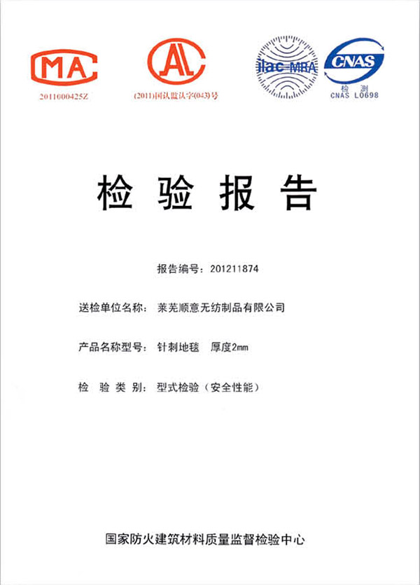 • 本公司生產(chǎn)的無(wú)紡阻燃地毯檢測(cè)合格